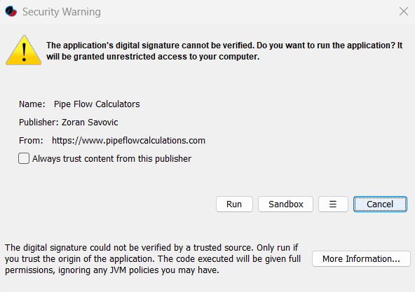 Pipe flow calculators are digitally signed application by a myself. During the installation process you will be informed about me as a publisher of this application.